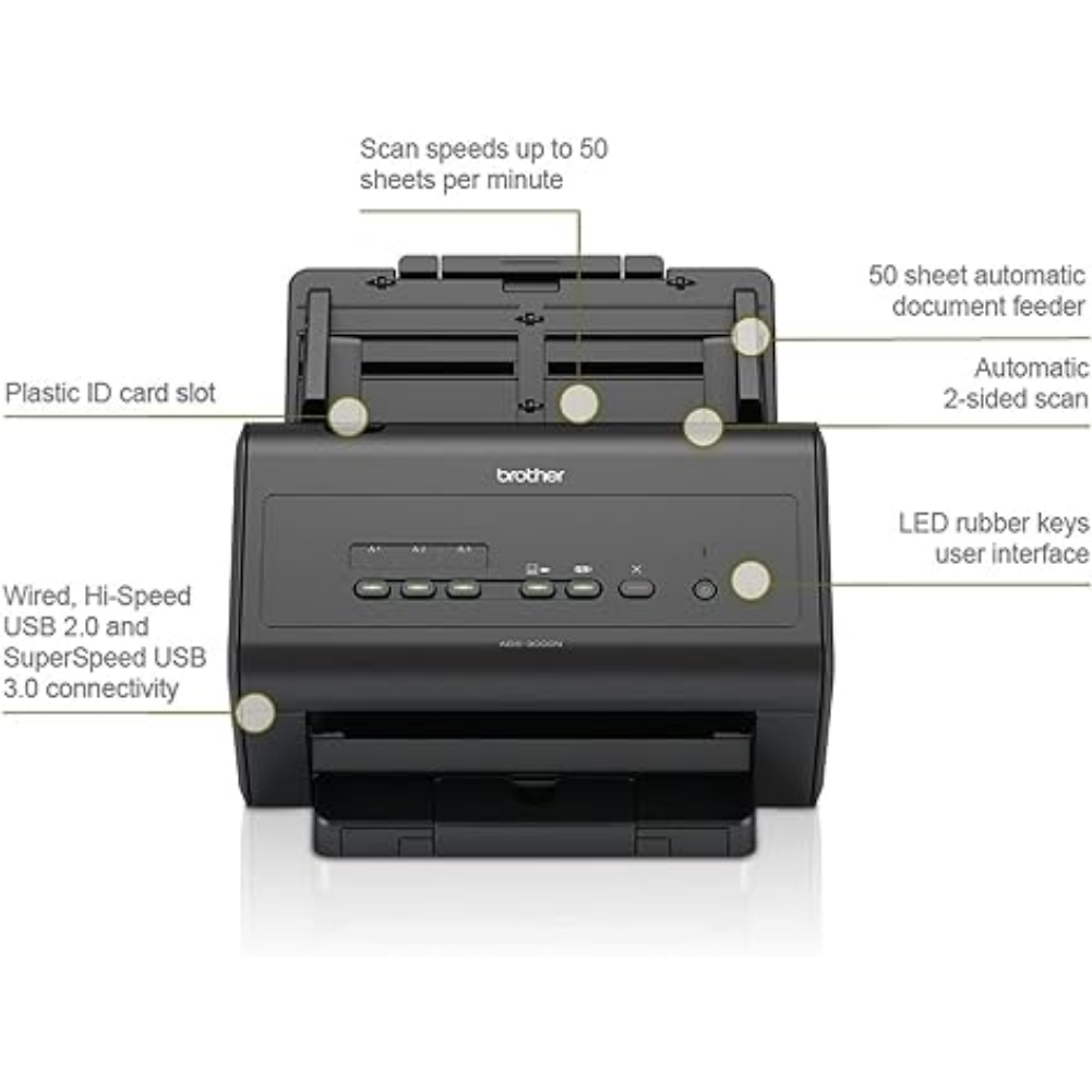El escáner Brother ADS3000N ofrece una velocidad de escaneo de hasta 50 páginas por minuto en formato A4. Permite escanear documentos a doble cara. Este dispositivo cuenta con conectividad Ethernet, lo que facilita la integración en redes. Soporta diversos formatos de archivo, incluyendo PDF y JPEG. Está equipado con un alimentador automático de documentos que tiene capacidad para hasta 50 hojas. Su pantalla de control permite una configuración sencilla y el acceso a diferentes opciones de escaneo. Es compatible con sistemas operativos Windows y Mac. El escáner incluye software que permite la gestión de documentos y la creación de archivos editables. La alimentación de documentos puede realizarse en distintas orientaciones, lo que proporciona flexibilidad en el procesamiento de diferentes tipos de documentos. Incorpora funciones de escaneo a correo electrónico, a carpetas de red y a aplicaciones específicas. Este modelo está diseñado para facilitar la digitalización de documentos en entornos de trabajo. Su construcción permite una utilización adecuada en diversos escenarios. La conectividad USB también está disponible para facilitar la conexión directa a dispositivos. El escáner tiene características de operación que permiten realizar tareas de escaneo de manera eficiente. Compatible con la mayoría de software de gestión documental, contribuyendo a un flujo de trabajo organizado.