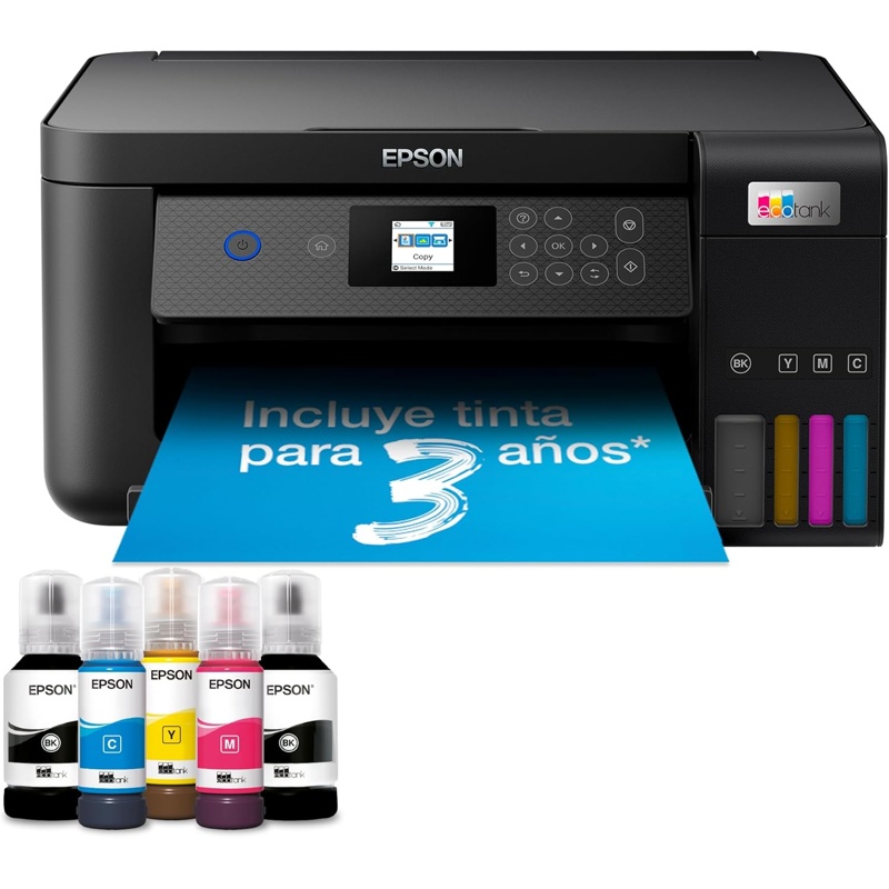 La Impresora Multifunción Tinta Negra Epson EcoTank ET-2850 cuenta con una capacidad de impresión de 33 páginas por minuto en formato A4. Este dispositivo permite impresión, escaneo y copia, ofreciendo conectividad Wifi para facilitar la impresión directa desde dispositivos móviles. La tecnología de impresión a tinta proporciona la posibilidad de realizar trabajos a doble cara de forma automática. El EcoTank ET-2850 incluye un sistema de tanque de tinta de gran capacidad, que permite la reposición de tinta mediante botellas, lo que reduce la necesidad de cambios frecuentes. También tiene una bandeja de papel con capacidad para una cantidad estándar de hojas, así como un alimentador de documentos para facilitar la carga de múltiples originales. El panel de control es digital y presenta una interfaz que permite acceder a las funciones de forma directa. La impresora es compatible con diversos sistemas operativos, incluyendo Windows y macOS, y puede conectarse a redes domésticas, lo que aumenta su versatilidad en entornos con múltiples usuarios. Su diseño está orientado a la integración en diferentes espacios sin requerir configuraciones complejas.