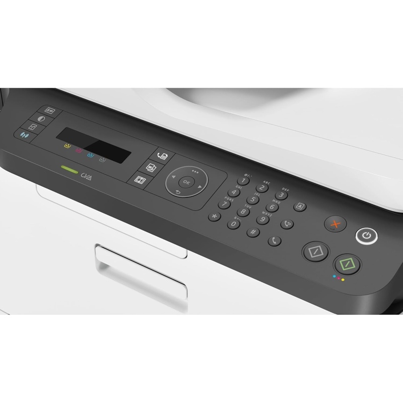 La Impresora Multifunción Láser Color Fax Wi-Fi HP Color Laser MFP 179fnw realiza funciones de impresión, escaneo, copiado y fax, con tecnología láser en color. Opera con conexiones Wi-Fi, USB y Ethernet, permitiendo la impresión desde dispositivos móviles mediante aplicaciones compatibles. La velocidad de impresión se establece en hasta 28 páginas por minuto para documentos en blanco y negro y hasta 21 páginas por minuto para documentos a color. Ofrece una resolución de impresión de hasta 600 x 600 ppp en modo normal. El escáner tiene una capacidad de entrada de hasta 50 hojas y permite la digitalización a color. La capacidad de papel se encuentra en 150 hojas en la bandeja de entrada y una salida de 100 hojas. Soporta varios tipos de medios, incluyendo papel fotográfico y papel mate. Es compatible con los sistemas operativos Windows y macOS, así como con diversos formatos de archivos. La impresora cuenta con un panel de control LCD que facilita la navegación por las funciones. Las dimensiones de la unidad son de 460 x 360 x 275 mm. El peso es de aproximadamente 16,5 kg. La impresora utiliza cartuchos de toner que tienen un rendimiento específico y están diseñados para este modelo. Además, permite la gestión de trabajos a través de funciones de impresión segura y permite enviar trabajos desde dispositivos móviles mediante impresión directa o aplicaciones.