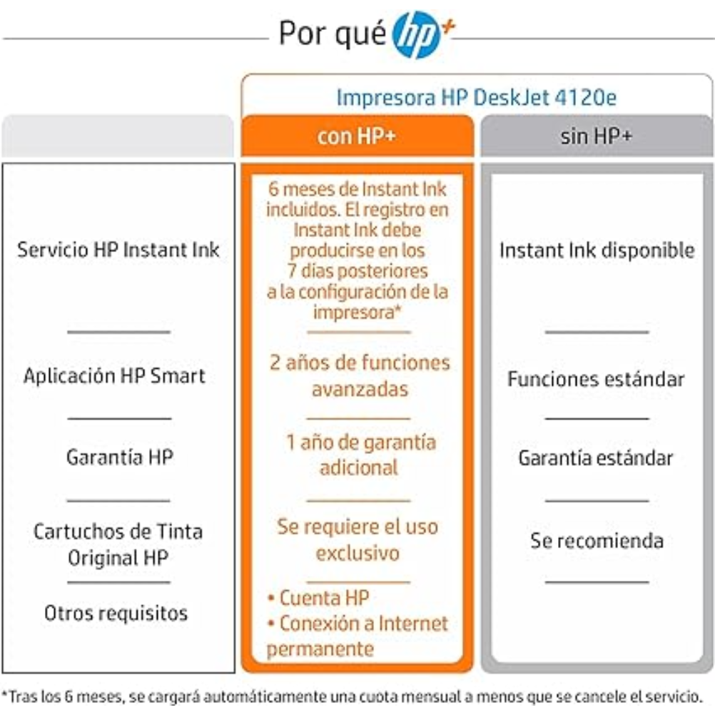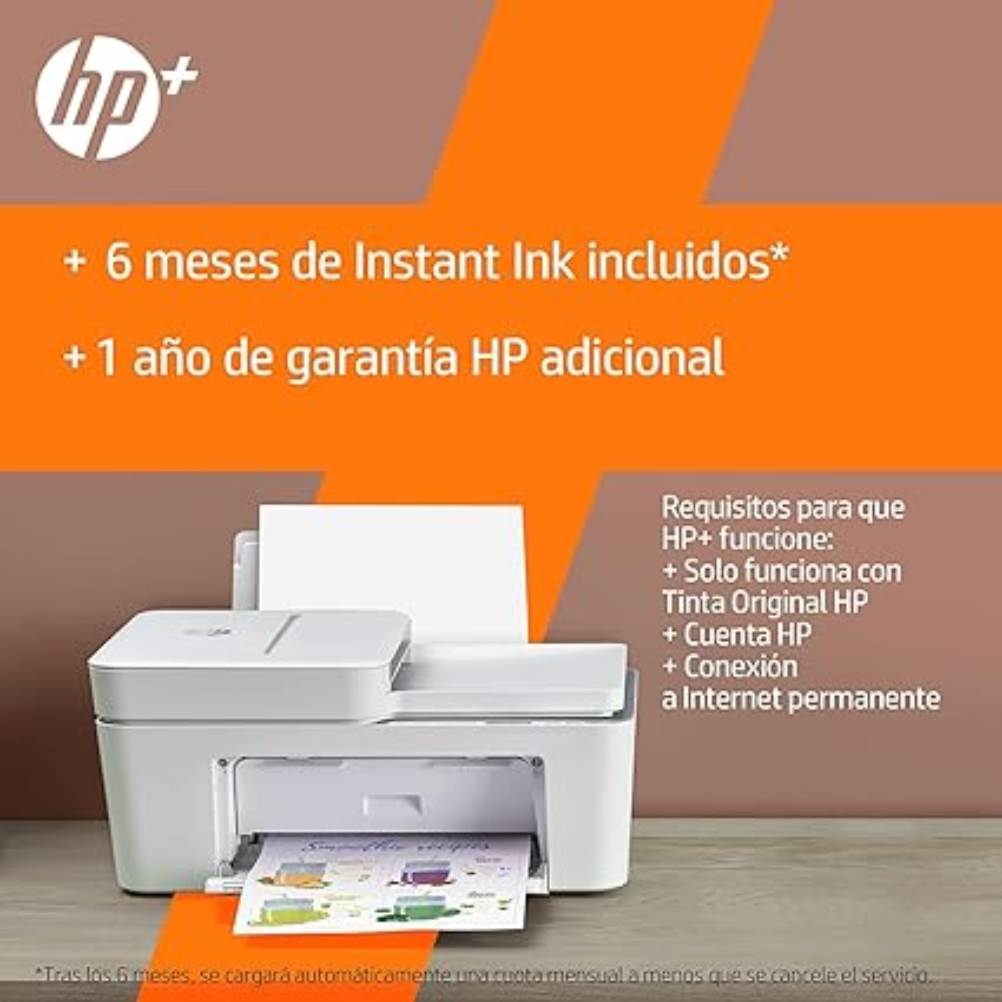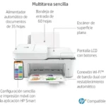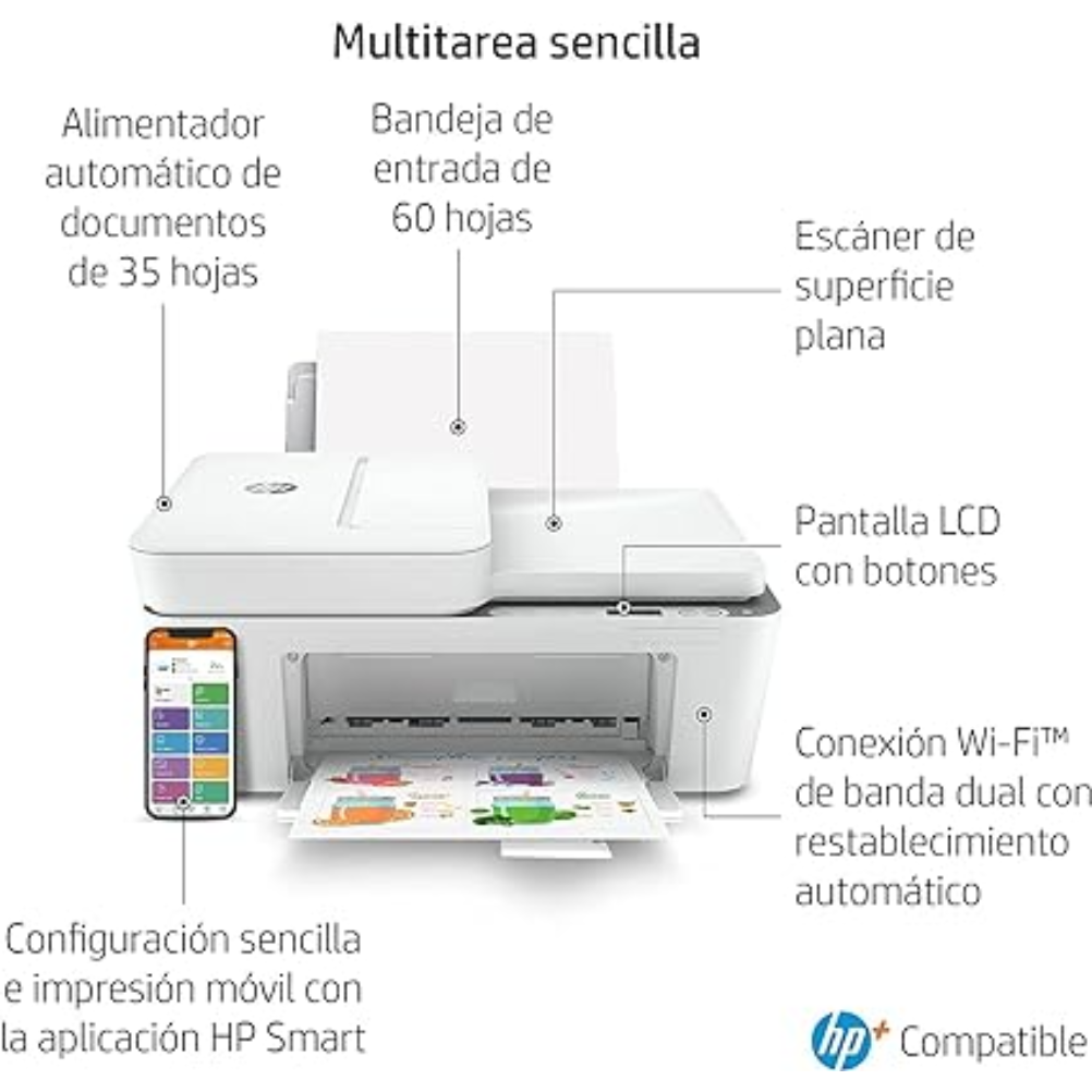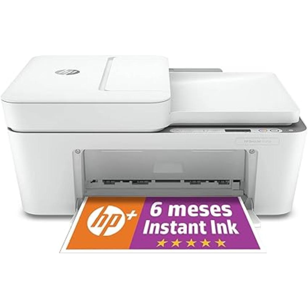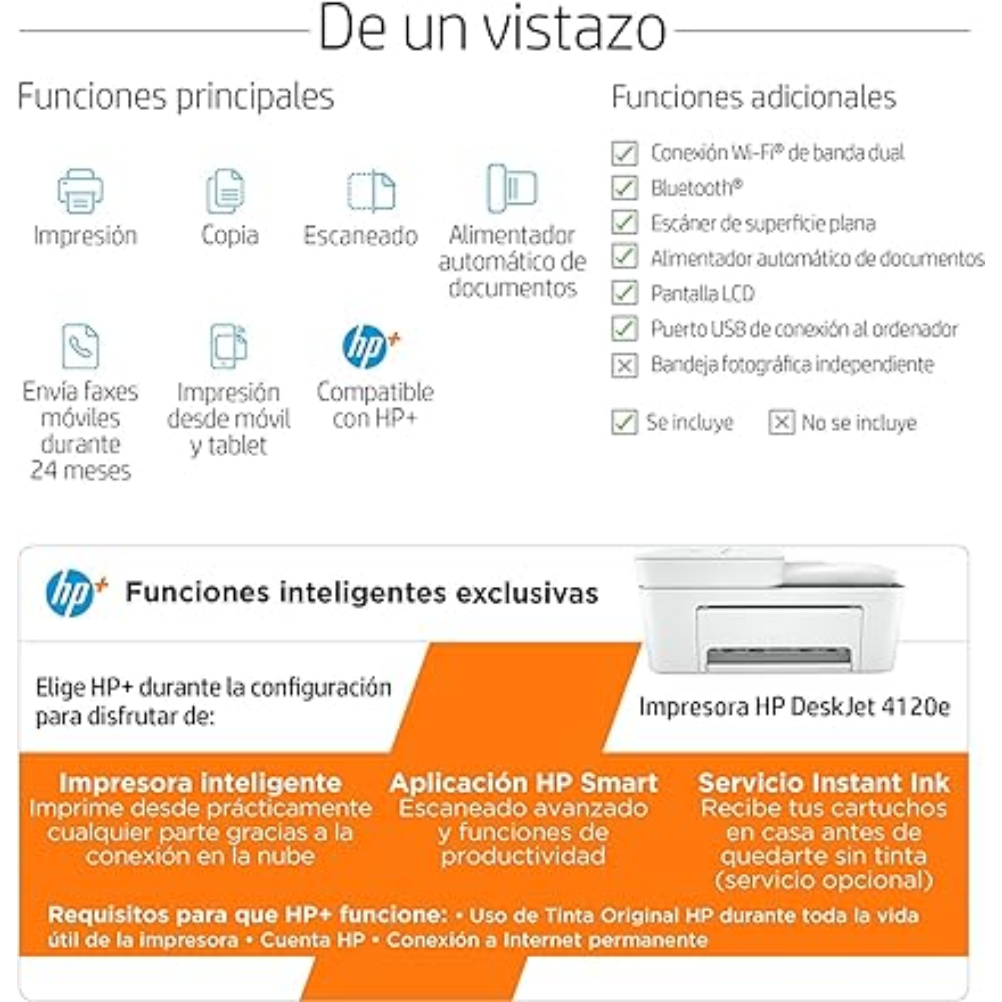 La impresora HP DeskJet 4120e es un dispositivo multifuncional que ofrece capacidades de impresión, escaneo y copia. Esta impresora utiliza la tecnología de inyección de tinta térmica de HP y es compatible con los formatos de papel A4 y otros tamaños estándar. Tiene una bandeja de entrada que puede contener hasta 100 hojas y una bandeja de salida con capacidad para 25 hojas. Permite la impresión a doble cara de manera manual. La velocidad de impresión en negro es de hasta 10 páginas por minuto y en color hasta 7 páginas por minuto, según las condiciones de prueba. Soporta diferentes tipos de papel, incluyendo papel normal, papel fotográfico y papel para presentaciones, entre otros. La conectividad se realiza a través de Wi-Fi, USB y tiene funciones de impresión móvil mediante aplicaciones compatibles, como HP Smart. La resolución de impresión alcanza hasta 4800 x 1200 ppp en papel fotográfico. El volumen mensual recomendado de impresión es de hasta 1000 páginas. Es compatible con sistemas operativos Windows y Mac, así como con dispositivos móviles que soporten las aplicaciones mencionadas. Incluye cartuchos de tinta de inicio y es posible adquirir cartuchos de tinta de diferentes capacidades para su uso.