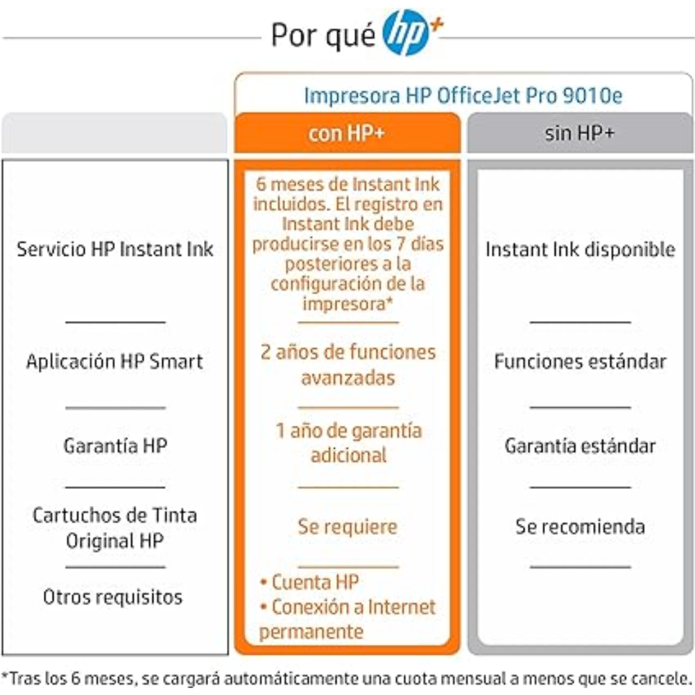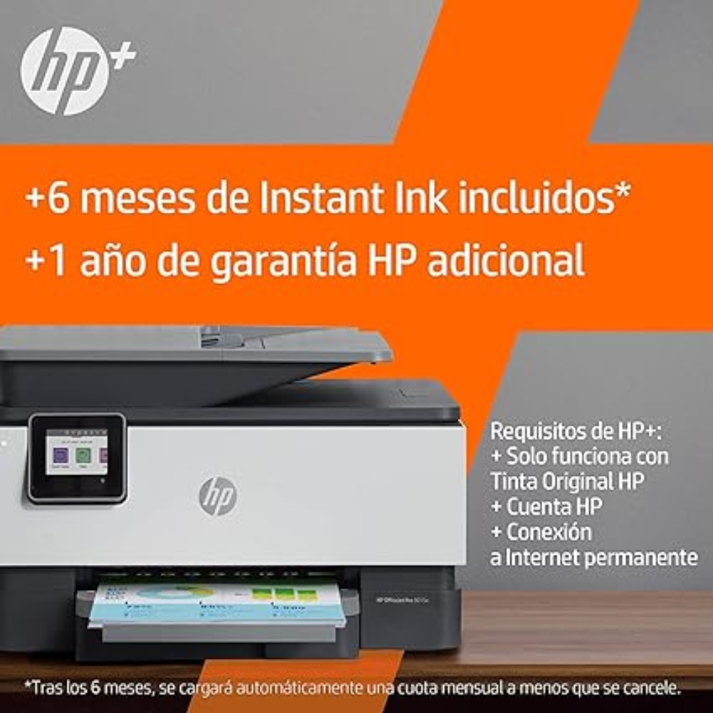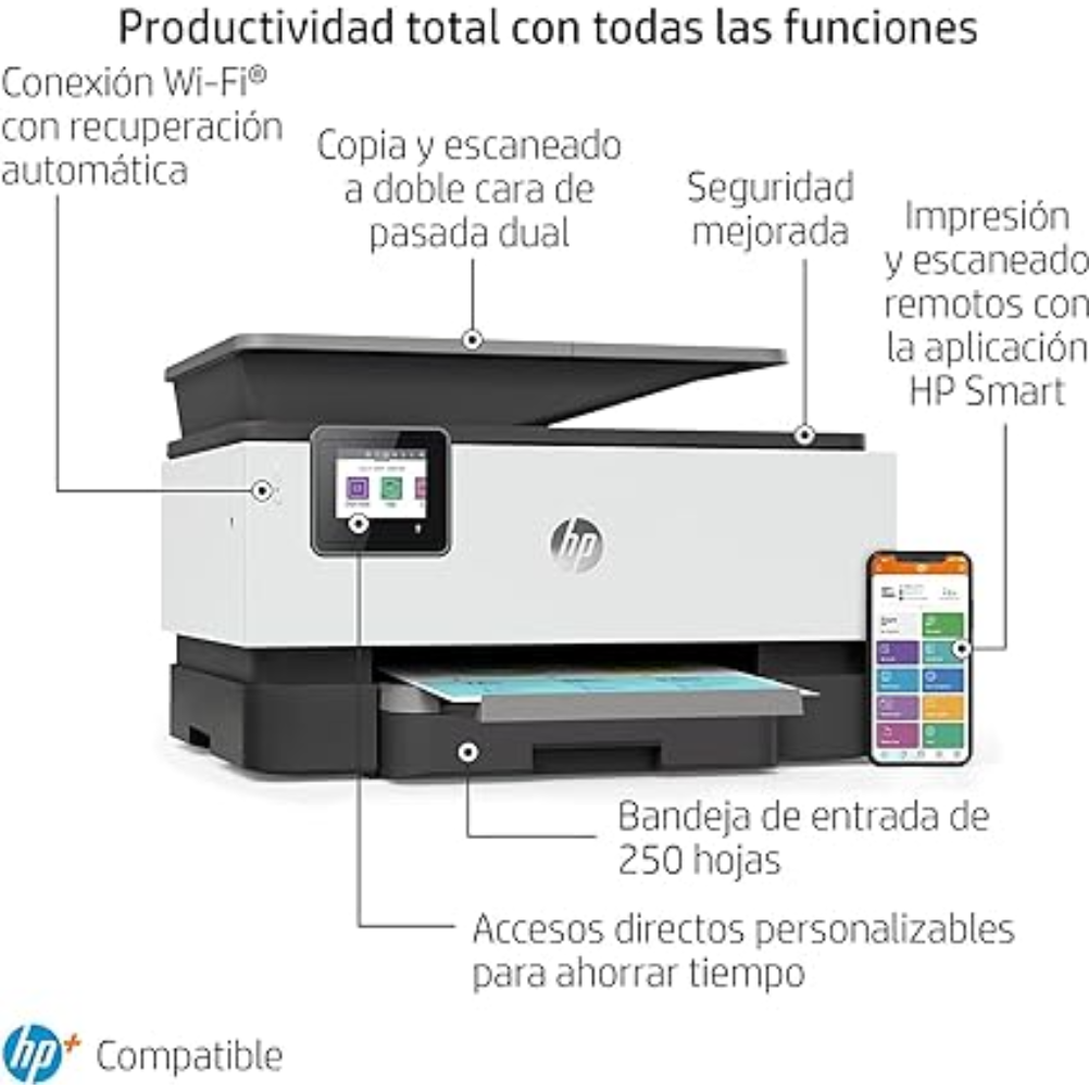 La Impresora Color 22 ppm Solución HP OfficeJet Pro 9010e ofrece capacidades de impresión a color con una velocidad de hasta 22 páginas por minuto en documentos en negro. Este modelo es capaz de realizar impresiones, copias, escaneos y envíos de fax. Utiliza tecnología de inyección de tinta térmica y posee conectividad USB 2.0, Ethernet y Wi-Fi, permitiendo la impresión desde dispositivos móviles a través de aplicaciones compatibles. El ciclo de trabajo mensual recomendado es de hasta 30,000 páginas, con un volumen mensual de impresión de hasta 2,000 páginas. Acepta una variedad de tipos de papel, incluyendo papel normal, de fotocopiadora y fotográfico, con soporte para formatos que van desde A4 hasta A6. La capacidad de la bandeja de entrada es de hasta 250 hojas, y cuenta con una bandeja de salida de hasta 150 hojas. Dispone de una pantalla táctil a color de 2.65 pulgadas para facilitar su uso. Esta impresora es compatible con sistemas operativos Windows y macOS, así como con varios tamaños de cartuchos de tinta, incluidos los de capacidad estándar y alta capacidad. El modelo también cuenta con funciones de impresión dúplex automática, permitiendo la impresión en ambas caras del papel de manera automática.